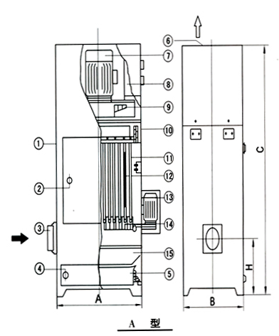 含塵氣體進入箱體,由扁布袋過濾器進行過濾,粉塵被阻留在濾袋外表面,已凈化的氣體通過濾袋進入風(fēng)機,由風(fēng)機吸入直接排入室內(nèi)(也可接管排至室外)。
